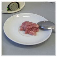 2. Cut meat sample into small pieces and weight approximatley 10 grams into a blender cup. Run duplicates on each sample.